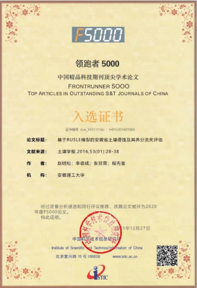 近日,由国家科技部中国科技信息研究所举办的“2021年中国科技论文统计报告发布会”通过网络直播方式举行,会上公布了“领跑者5000 ——中国精品科技期刊顶尖学术论文(F5000)”入选情况。永利集团官网赵明松副教授予2016年1月发表在我国土壤学科领域高水平学术刊物《土壤学报》上的《基于RUSLE模型的安徽省土壤侵蚀及其养分流失评估》论文,经过定量分析遴选和同行评议推荐,入选“领跑者5000-中国精品科技期刊顶尖学术论文”(简称“F5000”)。