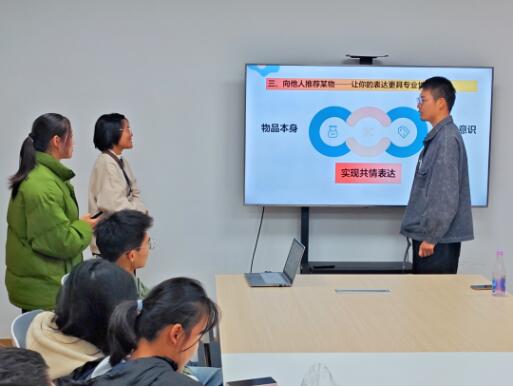 环节二是由常风姣老师主讲的互动游戏内容,通过即兴表达的方式锻炼同学们的表达思维和勇气,缓解同学们在表达过程中的焦虑。游戏一看图说话,目的是帮助同学们消除表达负担。游戏二找出重点,让同学们以图画中的某一细节展开想象并进行细节化描述,目的是使同学们的表达有目的性。游戏三向某人推荐某物,目的是使表达具有专业性,实现共情表达。同学们的发言与互动使本次训练营变得活跃。