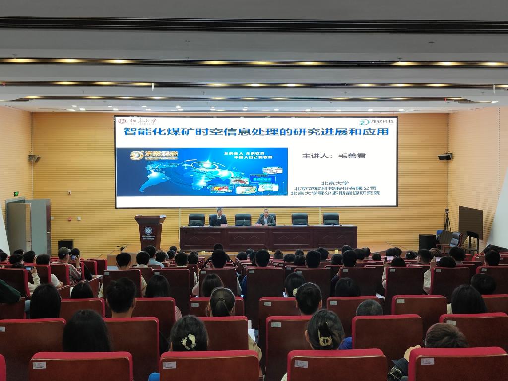 报告会上,毛善君教授强调了时空信息技术对煤矿智能化建设的重要性,针对煤矿智能化建设现状,结合北京大学和龙软科技团队在煤矿智能化建设中取得的丰硕成果,提出了“六化、六体、二模式、六链流”的高级智能化煤矿建设新模式,并以视频、图片等形式阐述了龙软智能管控产品体系在透明化地测保障、井下精确定位、“一张图”管控平台、智能化采掘、智能化通风、智能化洗选和大数据分析等方面的关键技术及应用情况。围绕“高科技煤炭”的建设目标——无氧开采,展望了未来煤炭开采可以像航空航天、高铁一样成为高科技象征的美好前景。毛善君教授鼓励同学们认真学习专业知识、掌握专业实践技能、提高软件开发能力,为智能化煤矿建设贡献自己的一份力量。