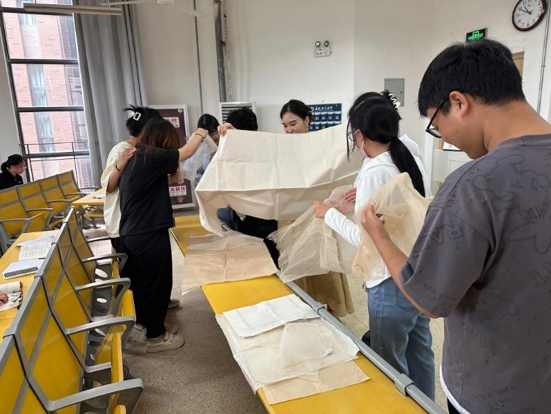 在体验环节,耿老师向同学们展示了古籍修复的工具、设备、材料,尤其是纸张,更为珍贵。她告诉了同学们在400倍显微镜下,纸张纤维图的判别方法。在讲座的最后,邀请了部分同学跟她一起学习如何鉴别各类纸张和古籍最简单的装帧方法。