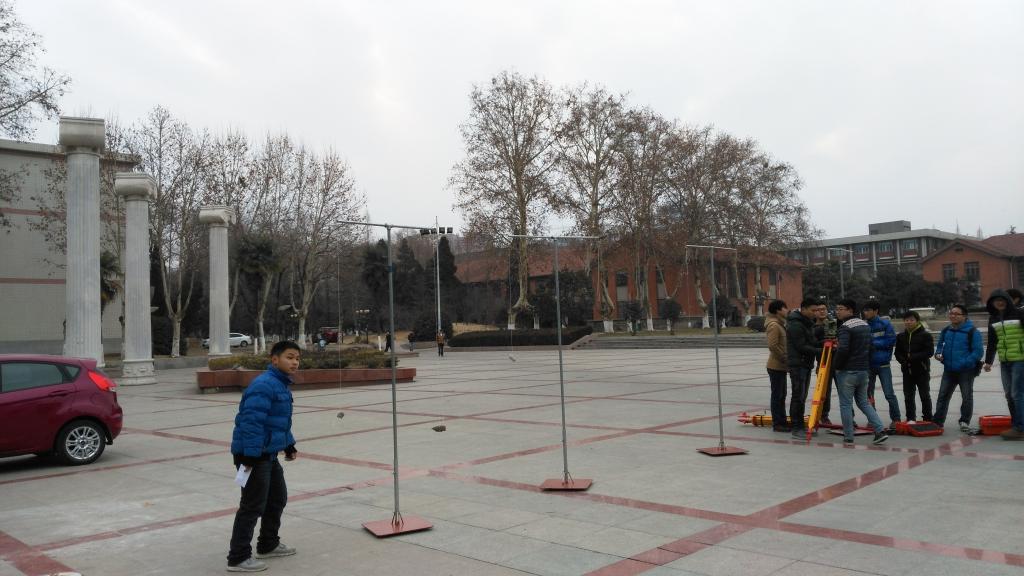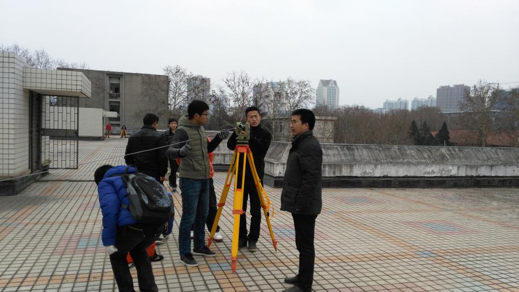 1月12至16日期间,在校园矿山测量模拟实习基地开展了矿山(工程)测量实习。矿山测量模拟实习内容包括两井定向测量、导入高程、井下控制测量、巷道中腰线标定和地面放样等矿山(工程)测量内容。实习基地将井下巷道测量系统搬到地面,替代井下现场测量实习。新建的矿山测量模拟实习基地以新附楼为中心,利用楼顶和地面分别模拟工业广场和开采水平、从楼顶向地面悬挂砝码模拟井筒悬挂钢丝、利用T型钢架有序排列和顶端悬挂垂球方式模拟井下巷道和顶板测点、采用夜间矿灯辅助观测模拟井下测量场景。在模拟矿山测量基地内,同学们不畏严寒,在实习老师严格的指导下,圆满地完成了实习任务。