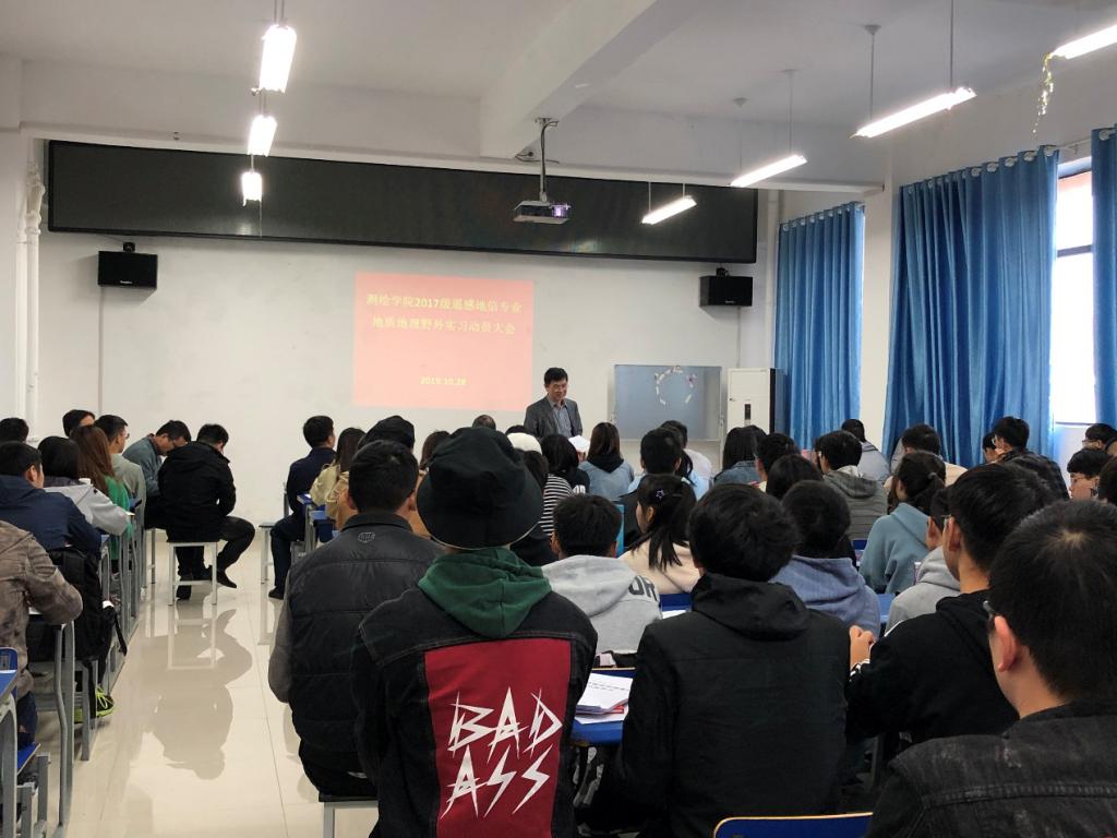 10月28日上午,测绘学院2017级地理信息科学、遥感科学与技术专业为期3周的地质地理野外实习动员大会在测绘学院北512报告厅举行。业务副院长余学祥、副书记兼行政副院长刘瑞、地信系主任王世航、遥感系主任刘超,以及实习带队教师出席动员会。2017级两个专业全体学生参加了会议。动员会由2017级学生辅导员马晓娜老师主持。