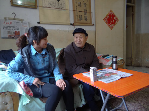 在社区工作人员的带领下,志愿者们来到了退伍军人王秀忠先生的家里,王先生虽然年事已高,但精神状态很好,早晨还去锻炼,加强身体的修养。对于学生们的到来,老人更是非常高兴。老人述说着他年轻时的业绩,抗战时的英勇场面,对抗战时期各种战斗的描述,老人在述说时,精神抖擞,仿佛又回到了当时的战斗,过去发生的一切仿佛就在他的眼前。更让人难忘怀的是老人还在观看时代的变化,还在看《人民日报》,了解十二届全国人大的会议内容。