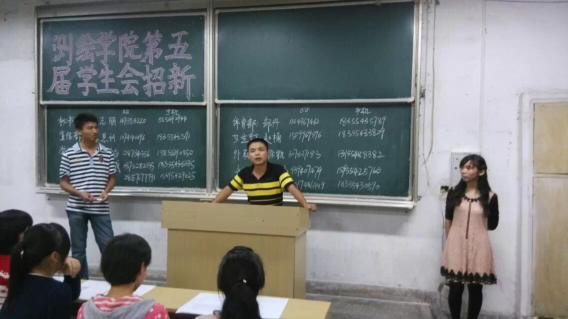本次招新工作分为宣传,笔试,面试三个环节.9月15日晚7点,招新宣传工作在合办楼正式开始.测绘学院学生会前任主席周卷,现任主席彭先敏,以及学生会各部部长,绿地通讯社负责人等参加了招新宣传工作.14级测绘学院新生被分到201,202,205,206四个教室,学生会工作人员事先向每位新生发放测绘学院学生会和绿地通讯社的宣传单及报名表.随后,学生会九大部门的部长以及绿地通讯社的负责人按照事先安排好的顺序依次进教室宣传.新上任的各部部长们意气风发,用充满激情的演讲叙述着自己在学生会的收获,用十分精辟的话语宣传自己部门的优势.新生也被部长们的热情所感染,不时举手礼貌的向学长学姐们咨询一些问题,各部部长耐心的加以解答.持续两个多小时的招新宣传工作,四个教室里掌声,欢笑声不断.青年人的青春活力,也让充满古朴气质的合办楼重新焕发了生机!