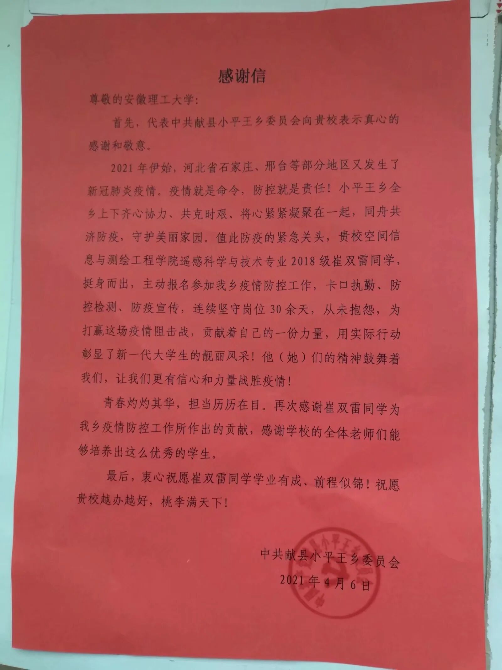 近日,304am永利集团官网收到了来自河北省沧州市献县小平王乡党组织对304am永利集团官网遥感科学与技术2018级1班崔双雷同学的感谢信。
